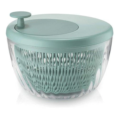 Spin&Store salad spinner washes and dries salad greens and all large-leaf vegetables quickly and effectively. Its compact container can also become an elegant salad bowl for use on the table. The internal basket has feet to keep it raised above the base of the container: thanks to this detail, the spinner can also be used as a container for defrosting foods, which are not immersed in water thanks to the feet which raise them off the bottom. The spinner also has a stay-fresh lid which can be fitted to the container for storing vegetables in the fridge.