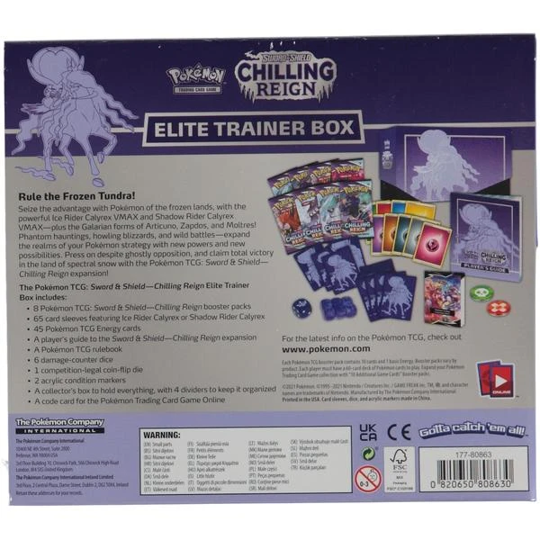 The elite trainer box includes, 8 booster packs, 65 card sleeves, 45 energy cards, players guide, damage counters, coin flip die, condition markers, storage box and a code card to unlock online content.