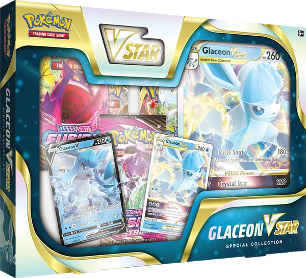 This VSTAR Special Collections includes: A promo card featuring Glaceon V An etched promo card featuring Glaceon VSTAR An etched oversize card featuring Glaceon VSTAR An acrylic VSTAR marker 4 Pokémon TCG booster packs An online code card