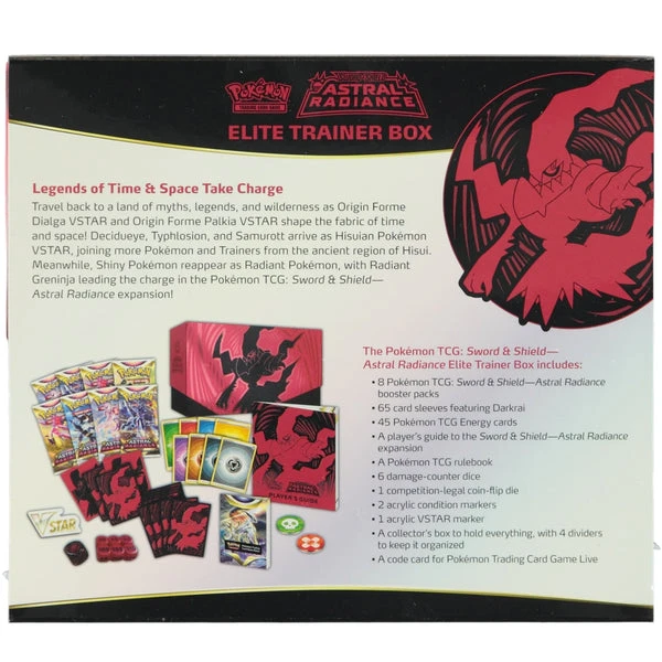 The elite trainer box includes, 8 booster packs, 65 card sleeves, 45 energy cards, players guide, damage counters, coin flip die, condition markers, storage box and a code card to unlock online content.